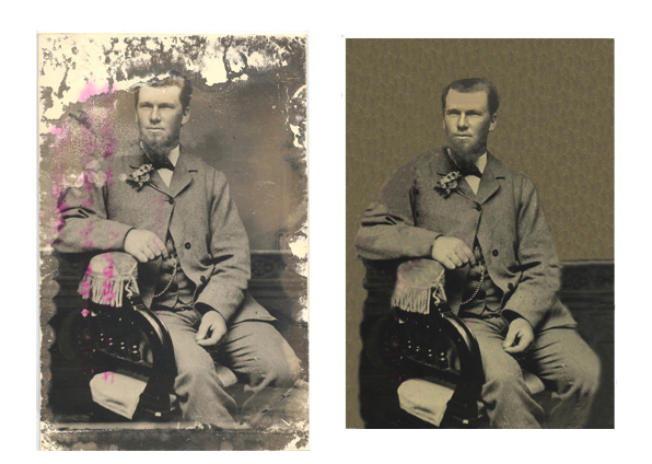 This is my wife's Great Great Grandfather (ca. mid 1800's). This offered lots of challenges, especially the hair. I could spend the next decade removing 100% of the pink ink as well (it's 99% gone). Again the clone tool to the rescue in addition to the healing brush (I'm using v7.0.1 Windows). There are big advancements with the the healing brush in later versions. Maybe someday I'll treat myself.