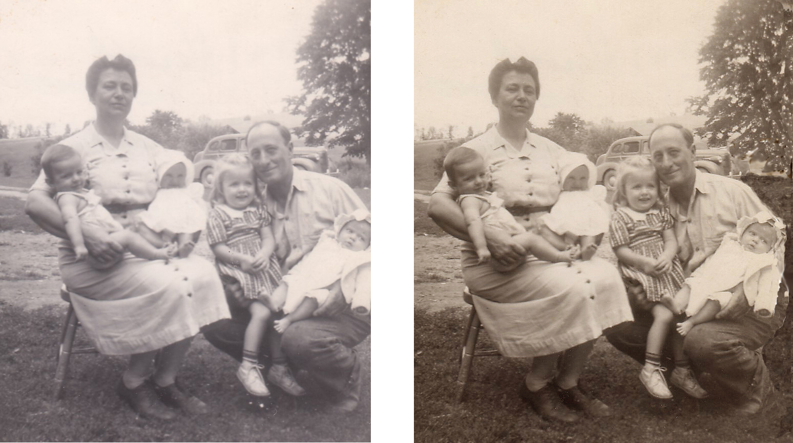 This is my sister in law's family and an example of additive restoration (adding to the baby's head and the father's rear end plus a little landscaping in back). The hue change helps eliminate the 'milkiness' in the original.
